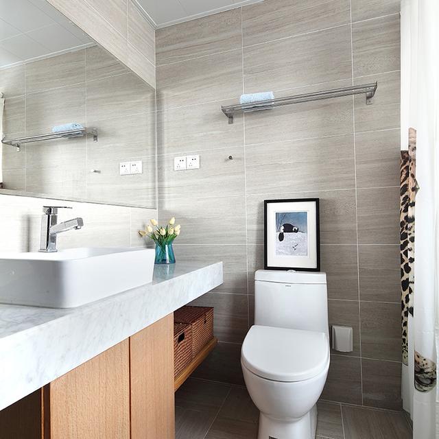 精心挑选了高级灰色的瓷砖,将卫生间装饰的非常沉稳大气,同时也能起到非常好的防水防潮效果,日常打理起来也更加便利。卫生间没有打造淋浴房,而是采用防水帘布将淋浴隔在靠窗的位置,既实用又能起到非常好的防水防潮效果,日常打理起来也更加便利。旁边的浴室柜采用高级灰色的大理石材质打造,下面有着丰富的储物空间,能够将洗浴用品整齐的收纳起来,让卫生间显得更加整齐大方。