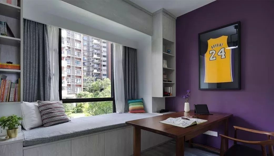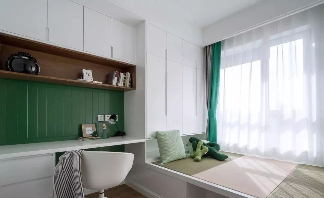 榻榻米床和衣柜结合在一起,刚好可以把卧室靠近窗户的空间都给用上,延伸一个书桌柜出来,也方便孩子平时读书学习。