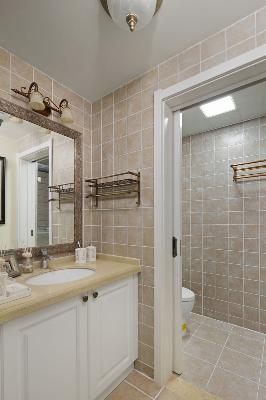 卫生间洗手台放在外头,实现干湿分离,白色卫浴柜搭配浅黄色台面,营造层次感。