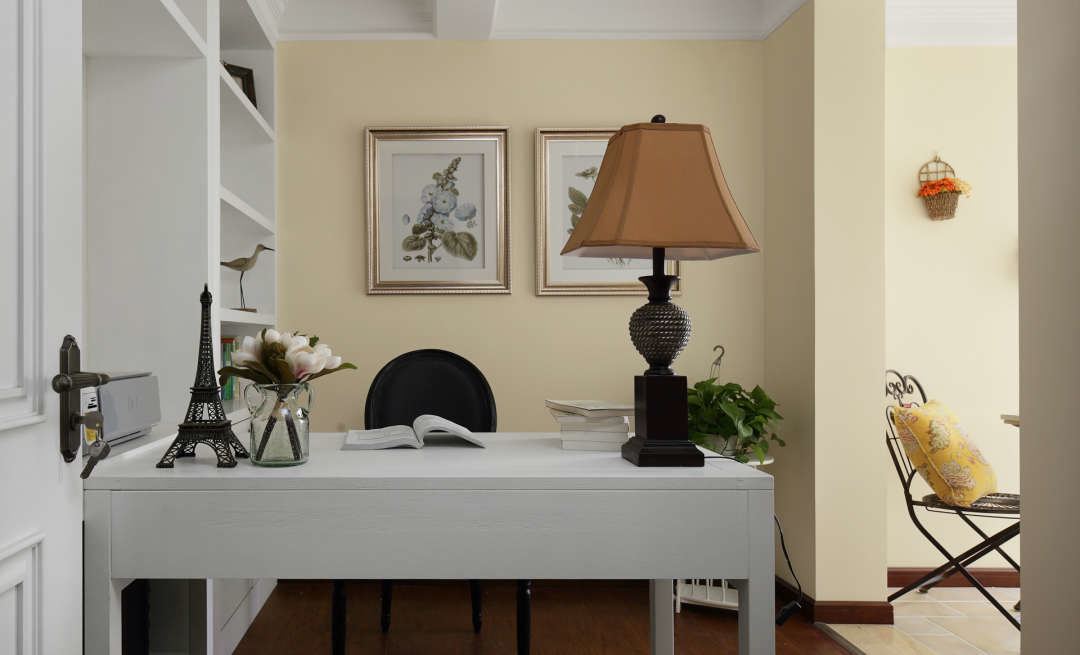 书房定制白色书桌柜,兼具展示和收纳功能,搭配上挂画、桌面摆件、台灯,凸显屋主的优雅气质。