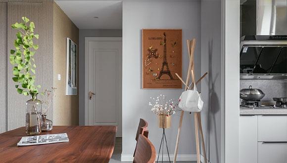 餐厅位置的面积虽然不小,却没有过多的装饰,摆上棕色的简易餐桌,再配上几把餐椅,轻松营造出温馨的用餐氛围。造型时尚的树叶吊灯,实用的衣帽架,恰到好处的软装搭配,提升了餐厅整体的装饰效果。