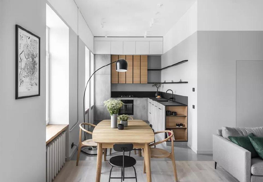 开放式的厨房包含了餐厅设计,极简风格的厨房竟没有一丝的油烟气息,木色的餐桌椅,更既符合极简主义对自由的向往。