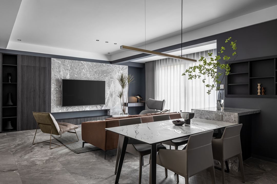 客厅和餐厅相邻,光线透过阳台窗帘延伸进来,保持空间光亮。电视墙用石材装饰,显得精致大方,旁边还有一个隐形门,通往卧室空间。