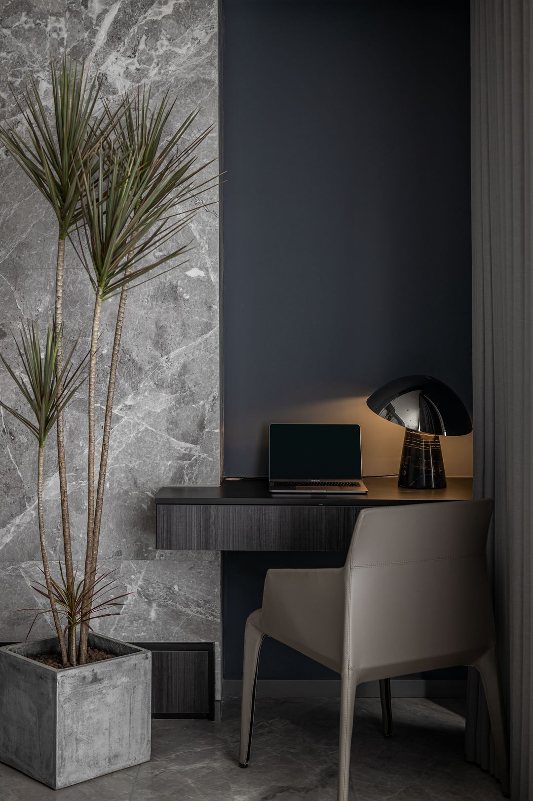 电视旁安装了一个悬浮的书桌,用于日常的办公,精致的台灯让这个小角落也凸显出高级感。