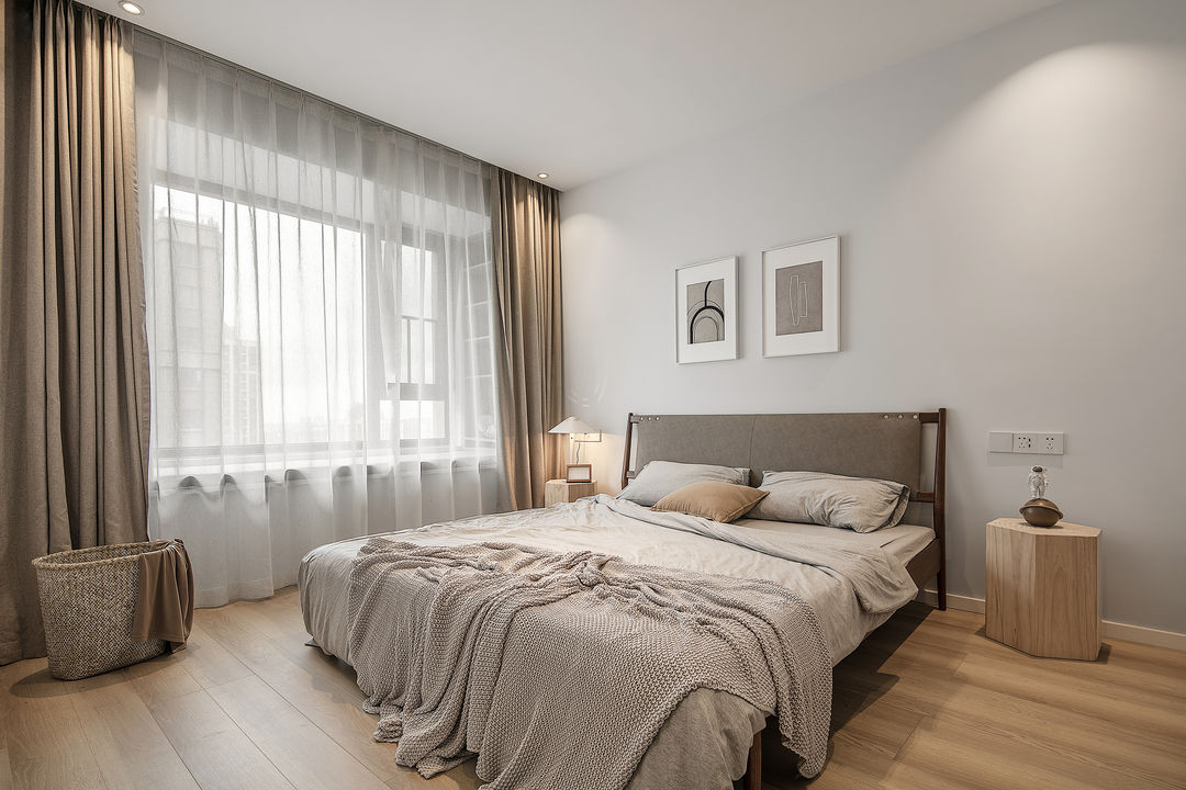 主卧通铺木地板,极简的顶面,两幅简约的装饰画搭灰褐色床,整个空间都让人由衷感到舒服。