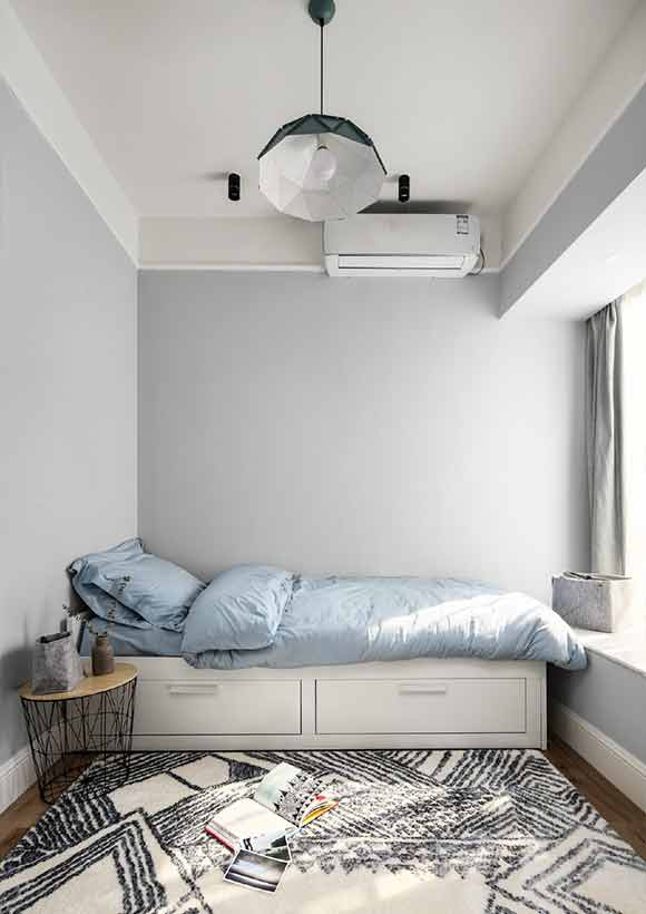 儿童房的里放置一张带抽屉的榻榻米,铺上浅蓝色的床上用品,没有过多装饰的空间干净清爽。很多人会在儿童房里定制榻榻米或者放置儿童床,但小朋友的身高一直在变,建议根据不同的年龄来选择合适的床架。如果是定制的榻榻米拆除麻烦,代价也更高。普通的儿童床换新费用也不低,还不如选择简单些的床品,换新代价不高也方便。