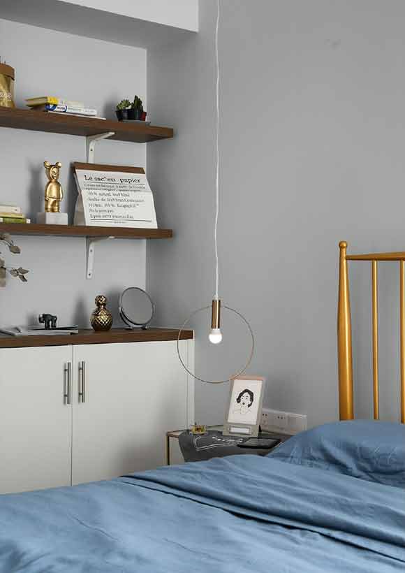 床架旁的墙面定制了一组矮柜,墙面安装了置物架,提升卧室的收纳能力,装饰效果也非常不错。床头处放置了简易的床头柜,再挂上一盏时尚的小吊灯来点缀,兼具了现代风格的时尚感和北欧风的舒适感。