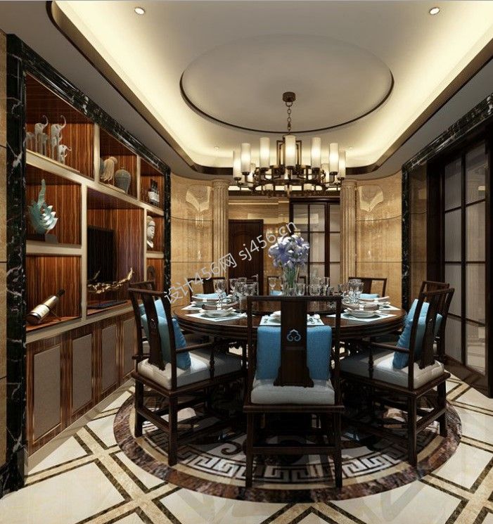 250平新中式风格别墅餐厅圆形吊顶装修效果图
