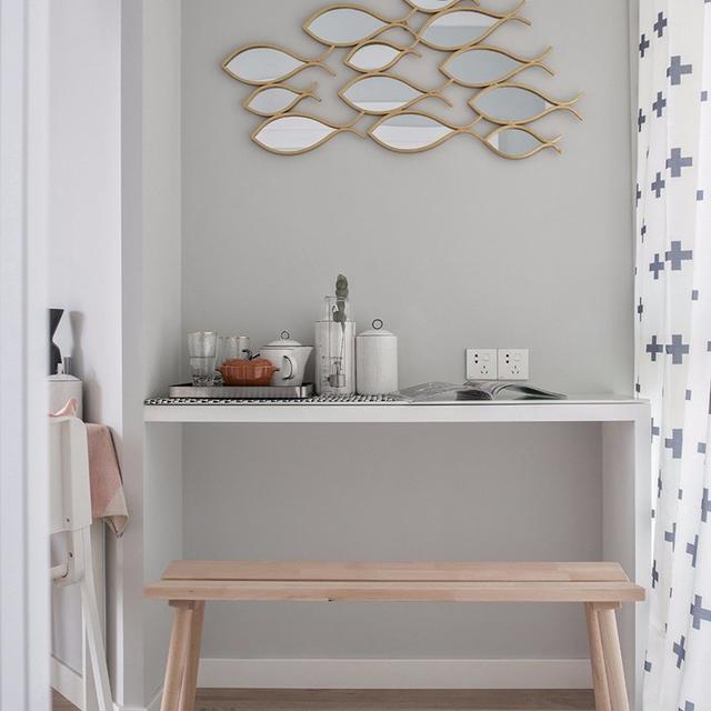 阳台墙壁上采用了时下非常流行的高级灰色,在背景墙上还装饰了这种精美的小镜子,使得阳台显得非常文艺有情调。在阳台靠墙还打造了一个精致的吧台,搭配一把长凳,可以把这里当做一个小茶室使用,喝茶的同时透过窗户还能看到外面美丽的景色,能够让生活更加惬意有情调。