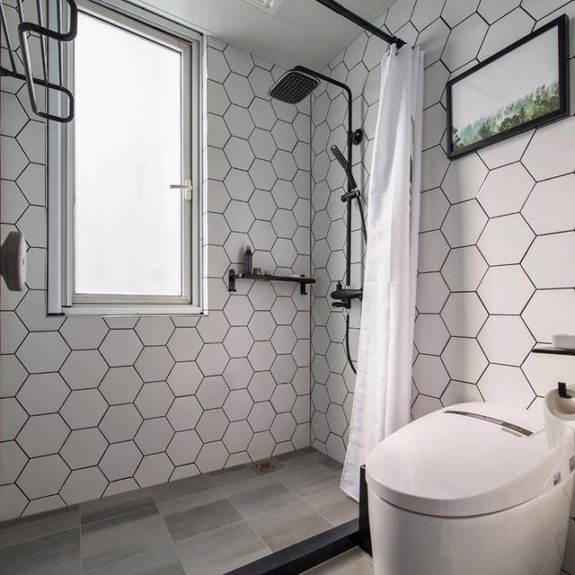 卫生间墙壁上采用了这种白色的六边形瓷砖装饰,与高级灰色的地砖非常好的搭配在了一起,使得卫生间显得非常时尚有层次感,同时也能起到非常好的防潮效果,日常打理起来非常便利。卫生间没有安装淋浴房,而是采用这种白色的防水帘布隔开,既不影响室内的空间感,同时也能起到非常好的防水效果,日常打理起来也更加便利。