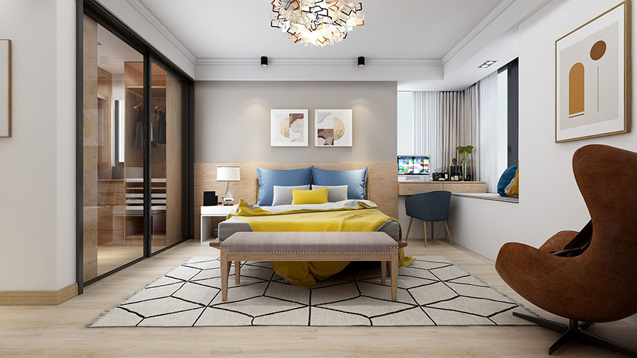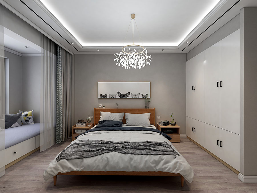 主卧以白色、原木色搭配蓝色等,延续了客厅的配色,便做为私人空间,更加注重的是舒适感的打造。