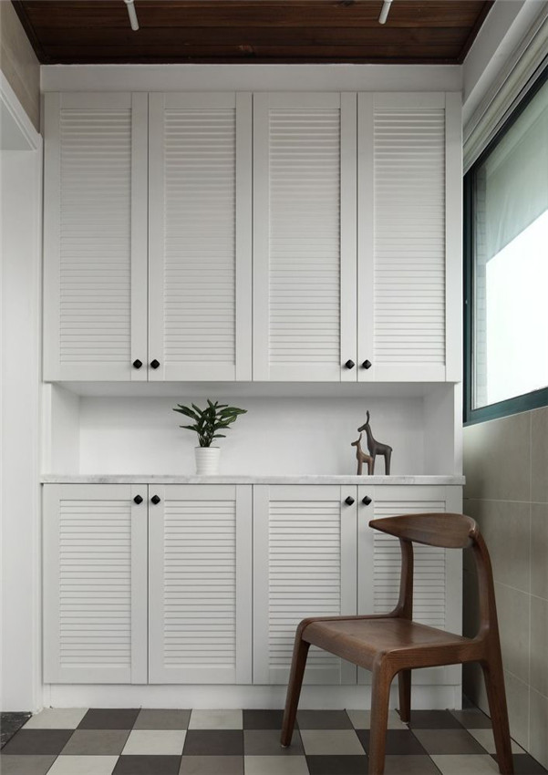 如果你,平时喜欢在阳台上休息喝茶啥的,那就可以选择吊柜+地柜的组合,中间可留0.3-0.45m左右的台面,随手放置东西。