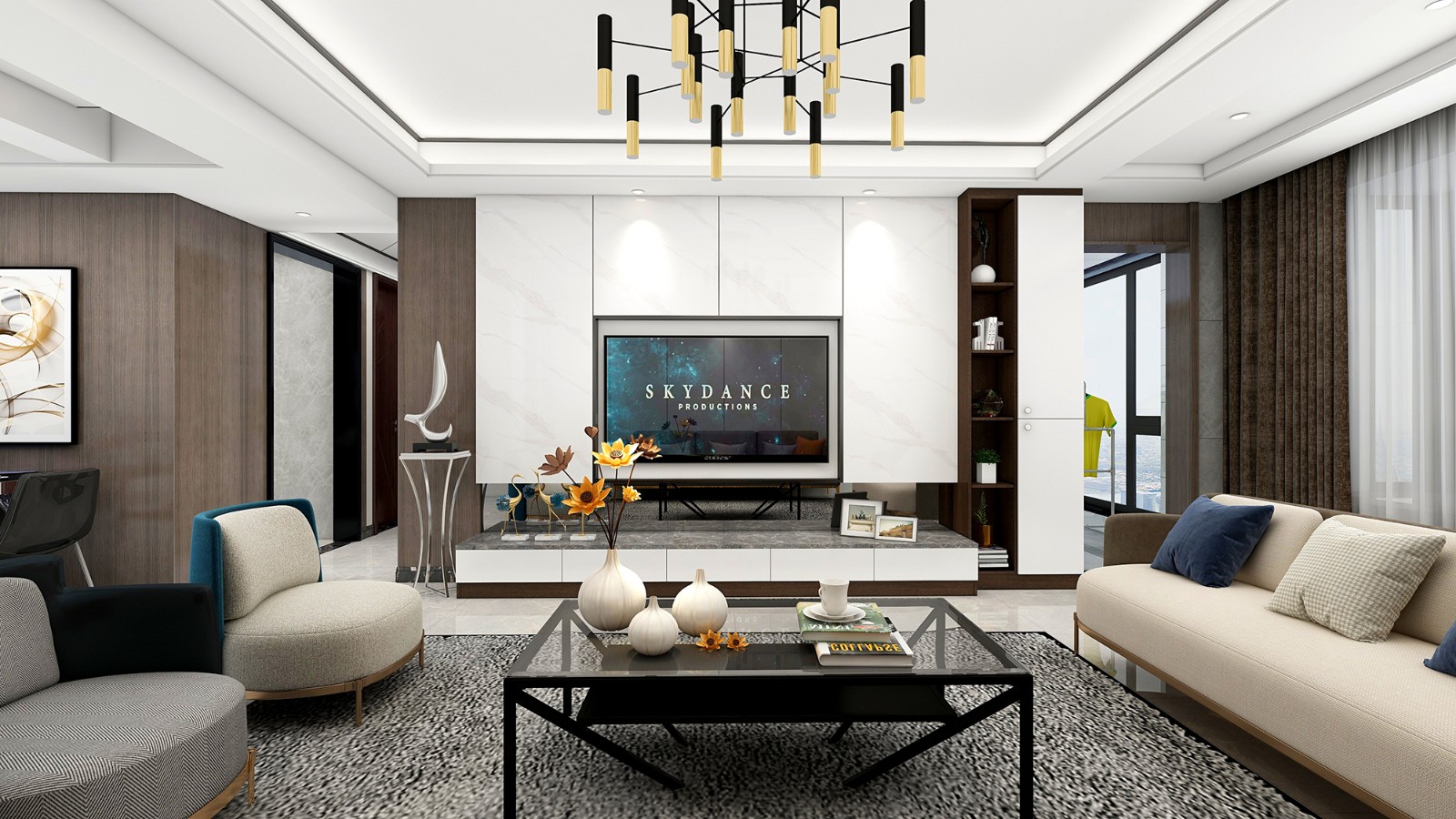 进门后,客厅位于右侧,一眼让人看见就是电视背景墙。