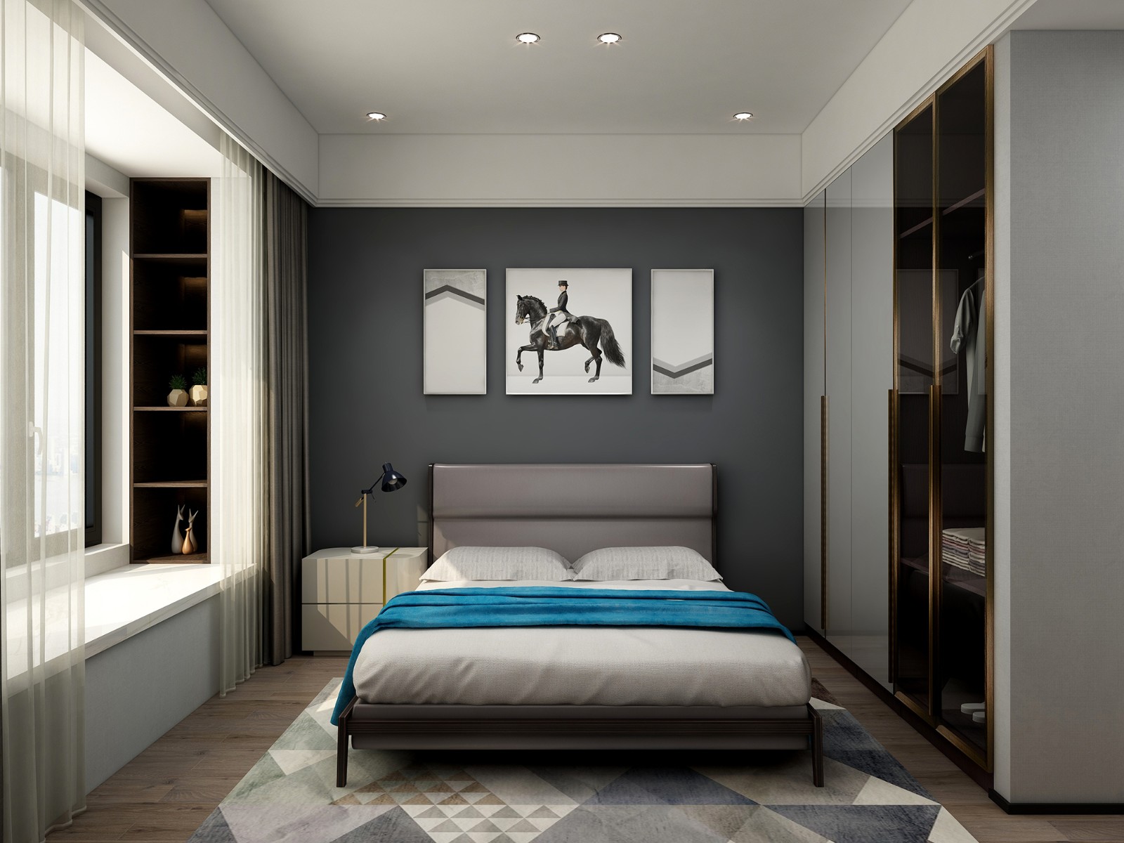 衣柜到顶设计,免除了顶部落灰的烦恼,统一的色系设计,让整个空间看起来更加舒适。