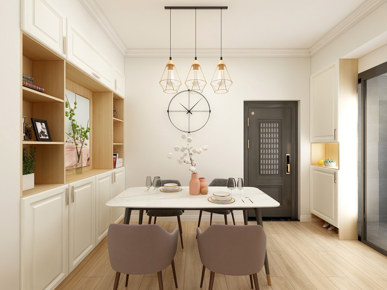 进门后就餐厅,嵌入式的餐边柜,方形的餐椅,随处摆放着绿植、小照片,充满了家的感觉。