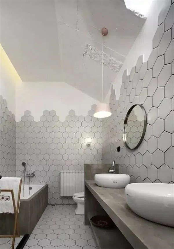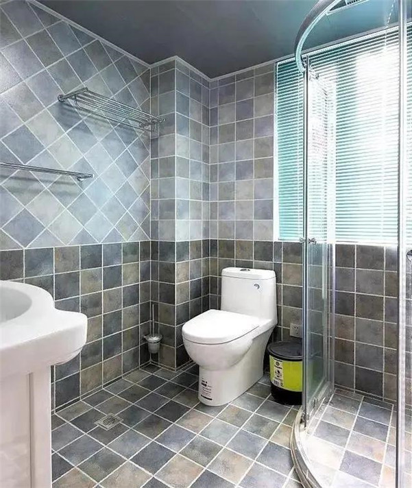 卫生间墙面上下分色给人一种强烈的视觉感应,上下分色是比较常规的铺贴法
