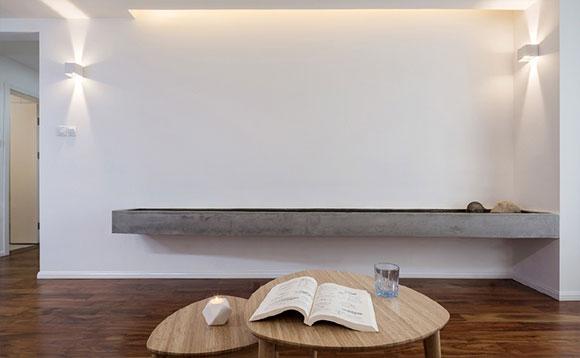 水泥加砖砌的电视柜直接挂在墙面上,底部悬空的设计不仅方便平时打扫卫生,也不会占据地面空间。电视柜采用凹槽式设计,里面装上水就能养上几条金鱼,这样的设计方式还真是从来没见过。