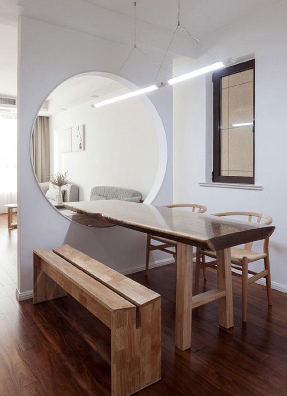 餐厅和客厅之间用砖头砌了半堵墙,墙面开了一个圆形的孔洞,配上一张手工制作的实木餐桌,让整个空间变得有点佛系的感觉。虽然说砖砌隔墙会让占据一些空间,但本案的设计方式却也依然值得学习,让空间隔断方式多了一种选择。