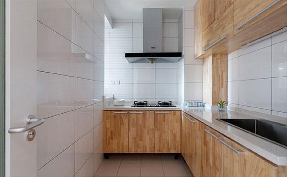 厨房的面积十分狭小,白色瓷砖装饰的墙面,配上定制的原木色橱柜,干净清爽的烹饪环境,虽然面积不大,却也基本能够满足日常的饮食要求。