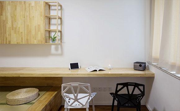 定制了榻榻米的小书房,靠墙位置安装一块木板来实现书桌的功能,墙面再装上原木色的吊柜,简洁大方倒也特别实用,关键是没有丝毫的拥挤感。不仅是书房,也可以是儿童房或者是临客房,大大提高了书房的功能性。