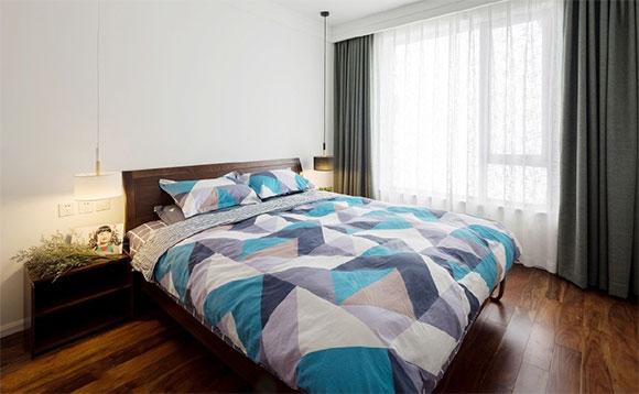 主卧室的面积还算不错,整体的装修设计依然十分简洁,白色的墙面,棕色的木地板,搭配棕色的床架床头柜,两盏造型简洁的小吊灯随意的悬挂在床头两侧,营造出的家居氛围格外温馨。