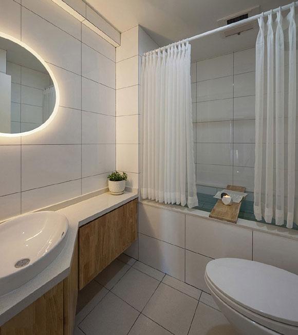 最后来看看卫生间的装修效果,白色瓷砖装饰的墙面和地面,配上定制原木色柜门的浴室柜,设计简洁配色清爽。面积虽然不大,却依然安装了浴缸,提升家居生活的舒适性。浴室外侧安装了白色浴帘,装饰空间的同时还起到了隔断的效果。定制的浴室柜造型设计非常巧,充分利用现有空间提升卫生间的收纳能力。