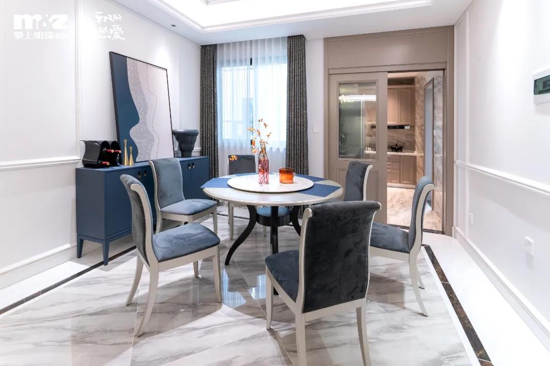 整体以家具的鎏金银色作为主体色,营造了整个空间沉稳又高级的品质主题氛围;通过肤感材质蓝灰色的背景墙,烘托出一种沉稳冷静的感觉;再加上黑棕色的家具漆面作为空间点缀,给整个空间带来了别致的现代感。