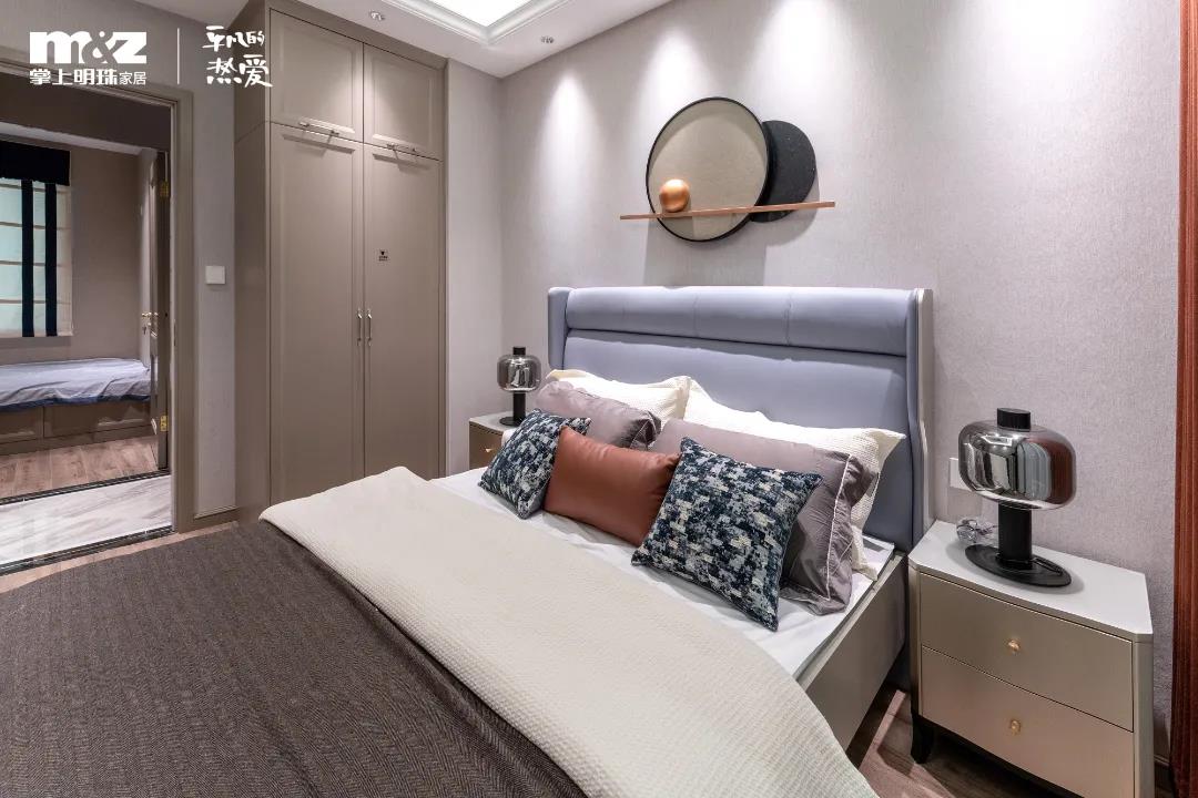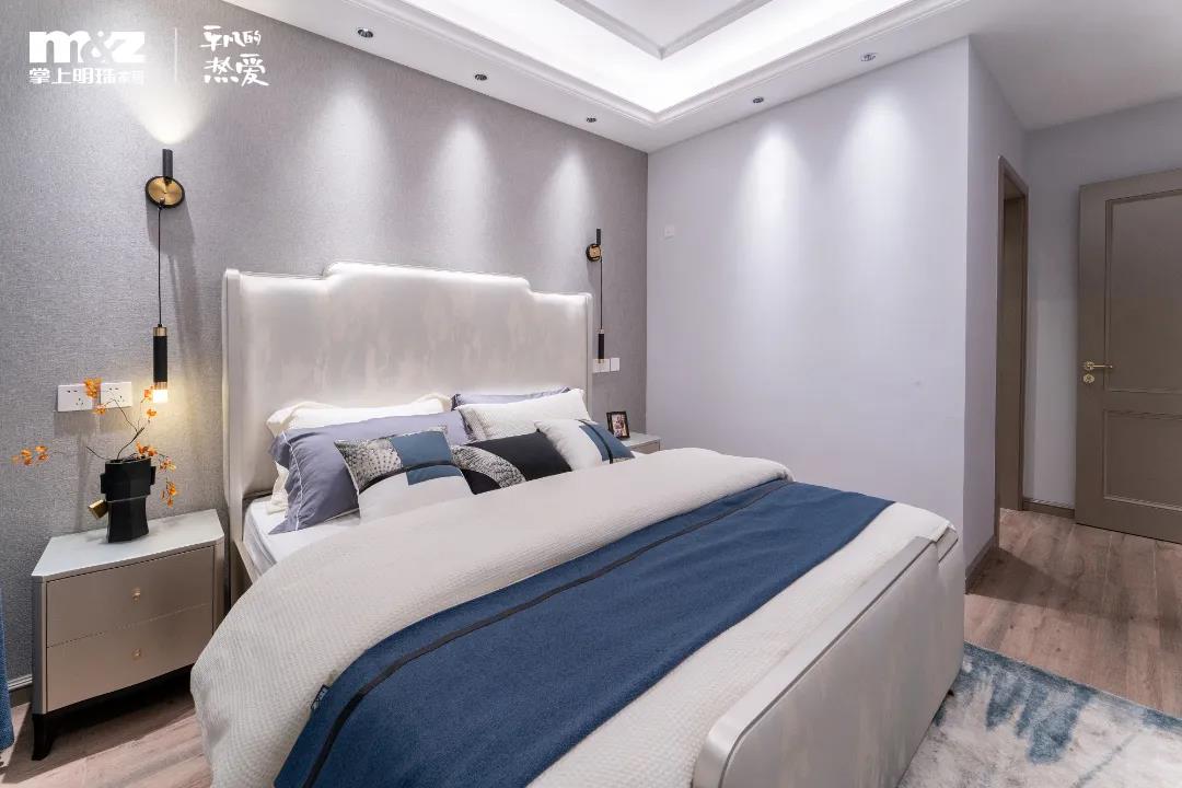 蓝灰色的亲肤质感布纹墙面,搭配苍灰色抽象乌云定制画,对称设计的精致壁灯,为全屋奠定了精致格调的基础。