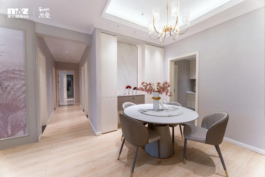 空间中央放置了一张多功能双层岩板餐桌,不仅具有优雅别致的纹理,上层转盘还能方便多人用餐;