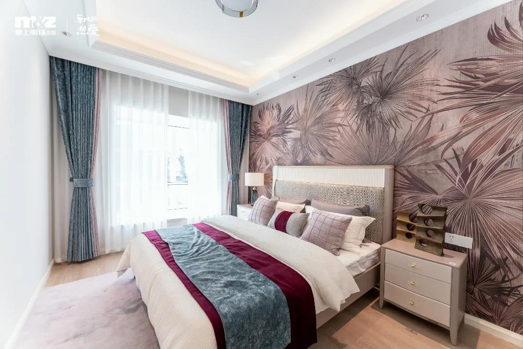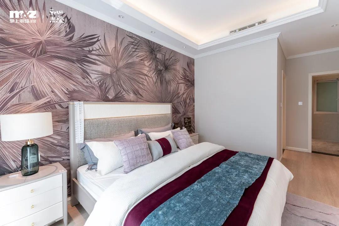 这张床呈哑光奶咖灰色,背靠着一整面明亮动人的粉调蒲葵背景墙。沿着蒲葵的延伸,空间感悠闲自然。撞色的蓝调软装饰,给人一种惊艳而时尚的感觉。