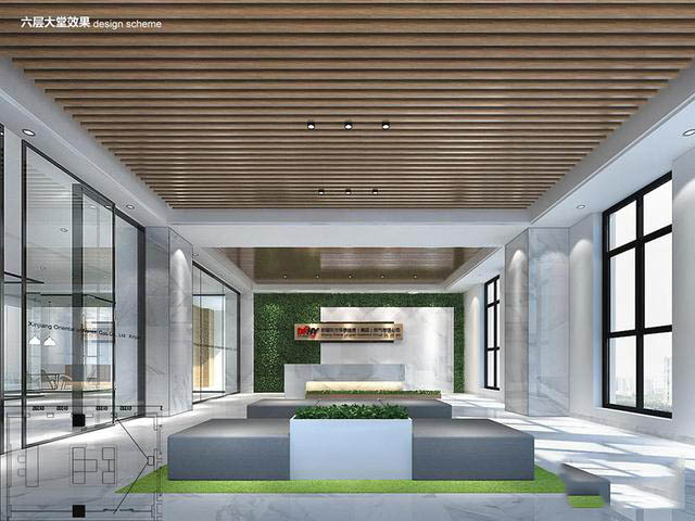 大堂区域以极具现代感的灰色作为主色调,顶部材质由石变木,线性木条掩映于天花之上,空间节奏徐徐推进,打造流动秩序感,塑造空间未来感。