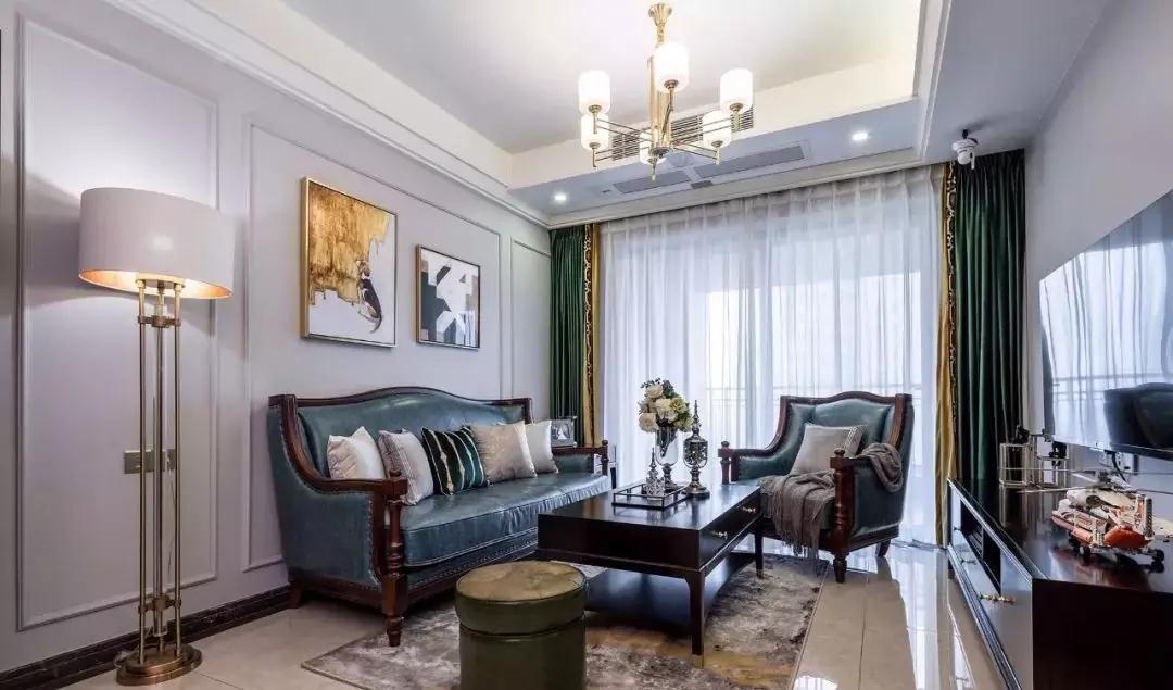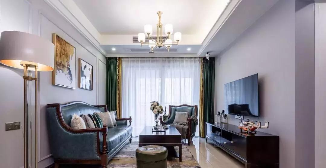 厚重的美式家具,搭配轻盈的灯饰与拼色质感窗帘,使空间精致温馨。
