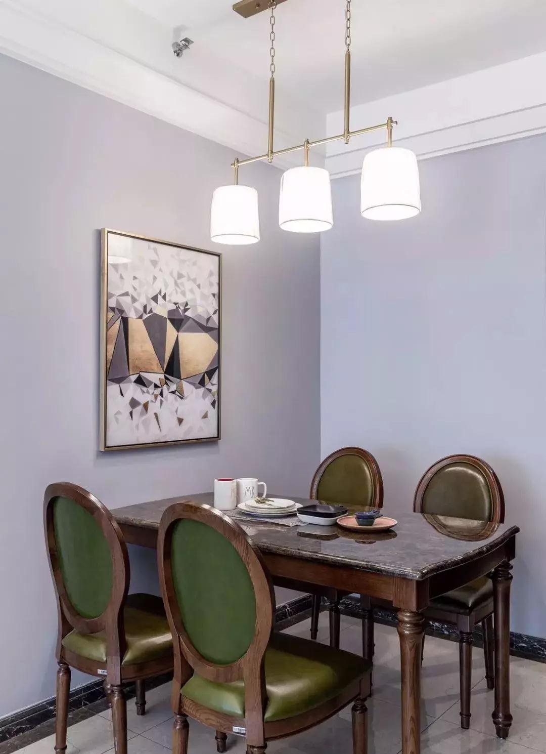 餐厅,大理石餐桌搭配绿色复古餐椅,墙面金色边框装饰画与吊灯呼应。