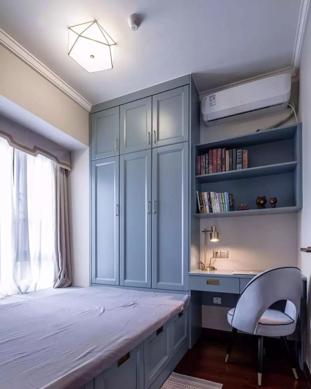 多功能房,以蓝灰色为基调,定制储物榻榻米与书桌柜,小空间可用于休闲、储物、办公、看书。