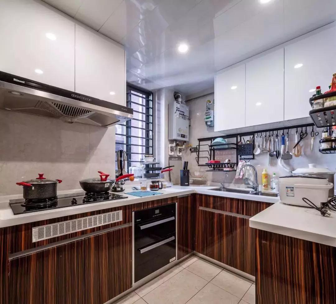U型厨房,白色吊柜搭配木色地柜,层次分明,洗区背景墙设计置物架与挂钩。