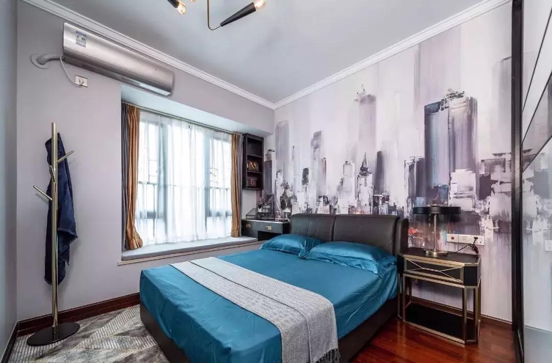 主卧,选用黑色现代高背床搭配蓝色床品,床尾的挂衣架,方便收纳过夜衣物。