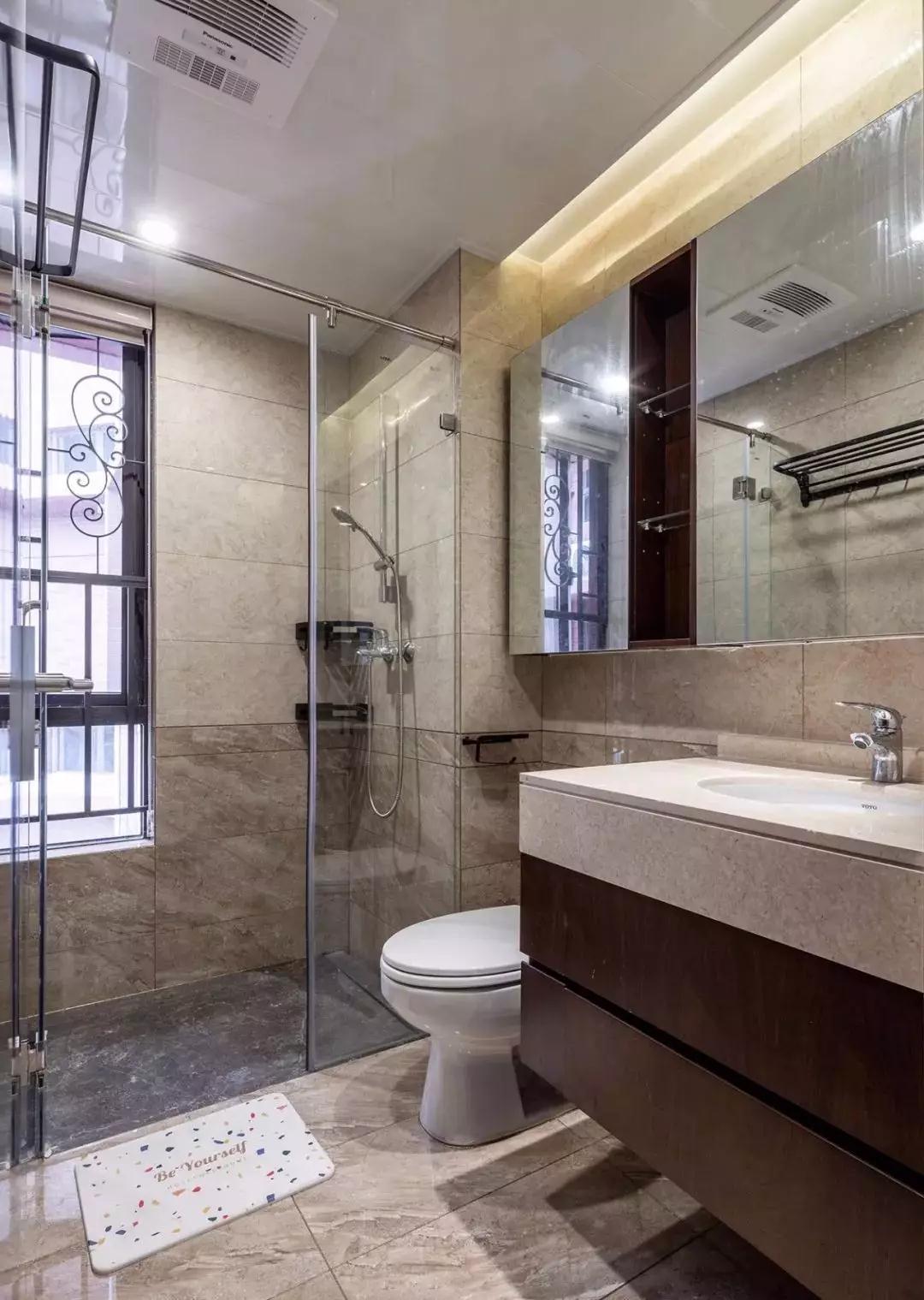 卫生间,墙面采用不同色调石纹砖拼接,设置镜柜与玻璃淋浴房,提高空间利用率。