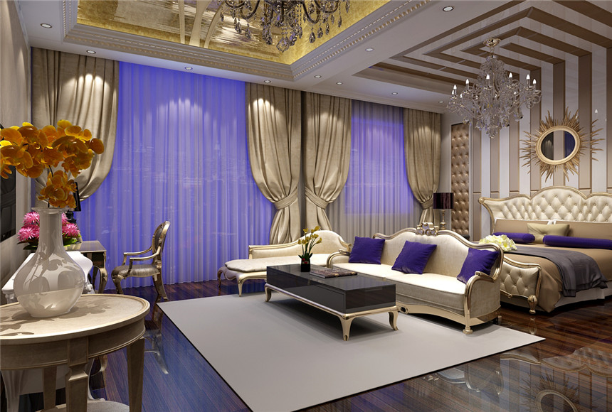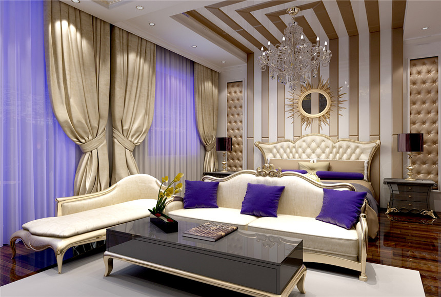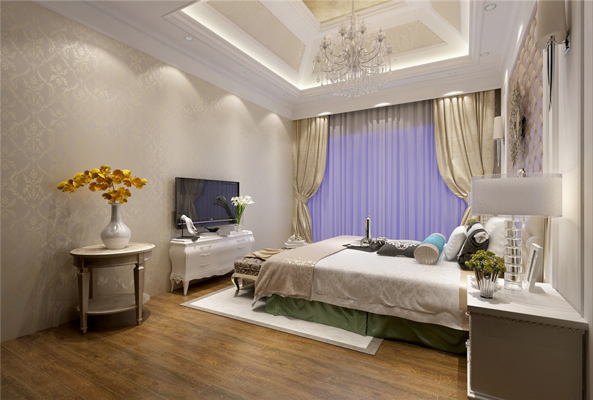 金边走线,在灯光的照耀下更加的光彩夺目,整个空间很靓丽。电视背景墙很简单,但是向外延申做了些展架可以放置书刊和饰品,增加客厅的活力。卧室是人们休息的主要处所,卧室布置得好坏,直接影响到人们的生活、工作和学习,所以卧室也是家庭装修的设计重点之一。卧室设计时要注重实用,其次才是装饰。卧室的装修还要注意它的颜色搭配以及材质选择,一起都要以舒适为主。