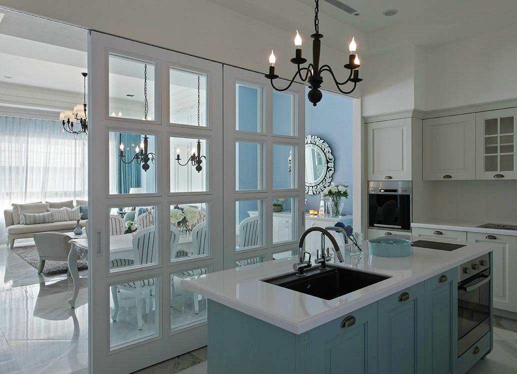 它是能够让厨房和餐厅连成一体,让空间变得更通亮。半开放式厨房隔断主要采用的是玻璃,通过透明的门体隔离厨房和其他空间,同时又可以看到外面的一切,并且玻璃门的反光作用还能增加室内的亮度扩大视觉上的空间感。半开放式厨房给人一种清新、自然的美感,它打破了传统的厨房的设计,做到时尚与使用的结合。