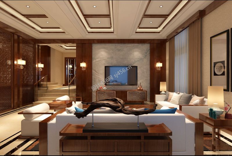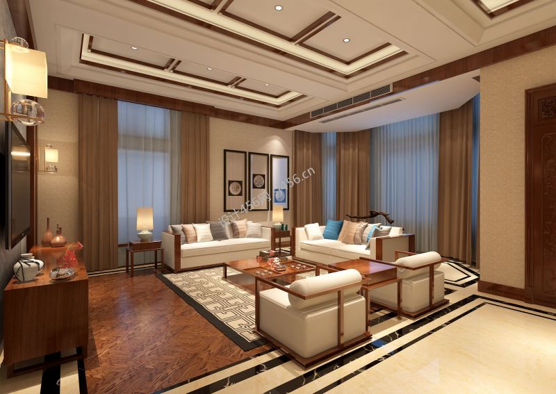 简约中式别墅客厅吊顶设计效果图