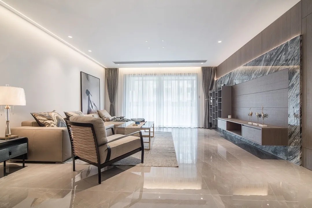 天然黑白纹理大理石与锯齿纹木饰面搭配,简洁大方的电视背景,似乎蕴含接近黄金比例尺度密码,带来强烈的视觉冲击,富有层次的对比让整个客厅于平缓的节奏中增添一丝跳跃。