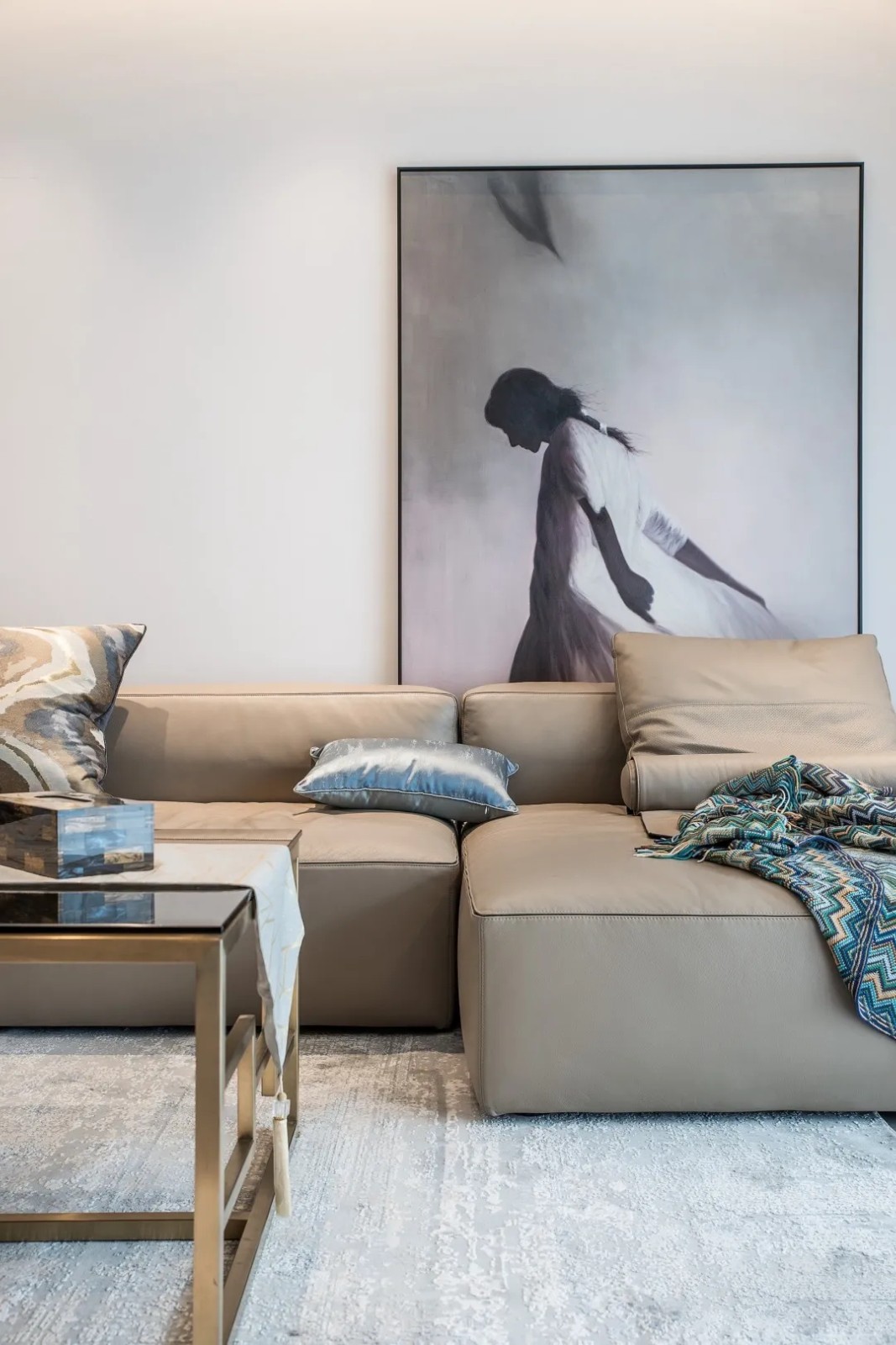 整个空间的布置精心且雅致,简洁考究的灰色系皮质家具,适时摆放的摆件,铺陈的白灰色系纹饰地毯,都让其不失为待人接物的最佳场所。