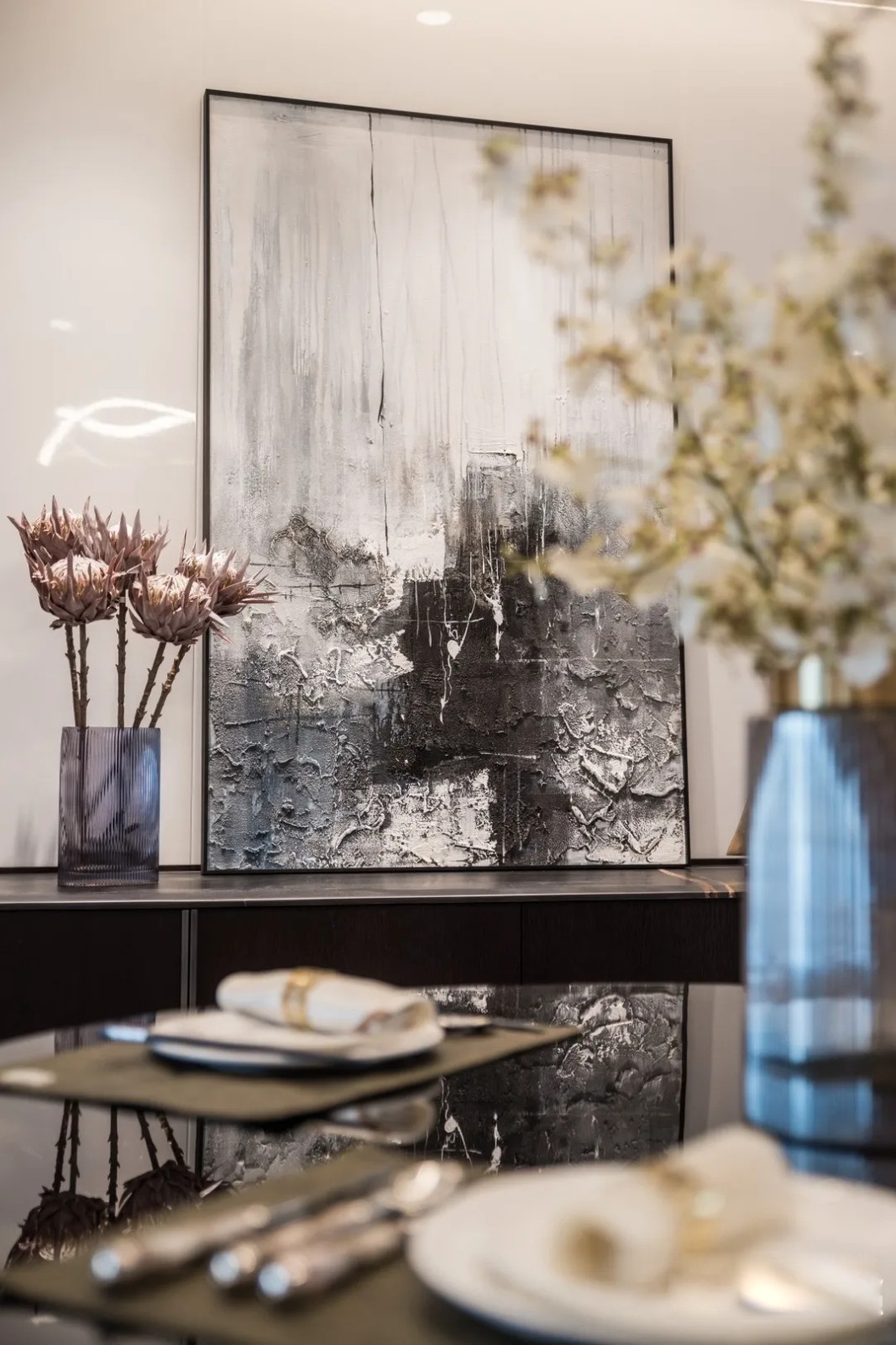 餐桌餐椅与空间整体色调一致,给人沉稳尊贵印象,杯盘温润,加以金属构件装饰,为视觉路径创造停留点。