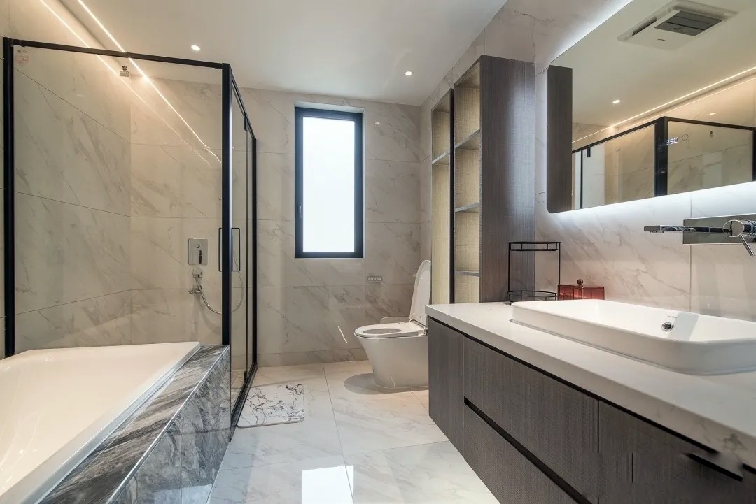 卫生间大气恢弘的爵士白大理石,碰撞出空间深邃静雅的氛围,在细节处彰显豪宅之尊贵。