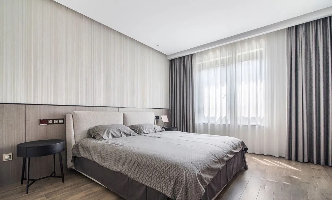 一个注重结构美,骨架美,建筑美的室内空间,色彩是我们需要谨慎考虑的。卧室采用中性色调,配合浅灰色布艺窗帘和实木地板等,创造一个有层次的空间,在繁忙间拥有纯粹的安宁。