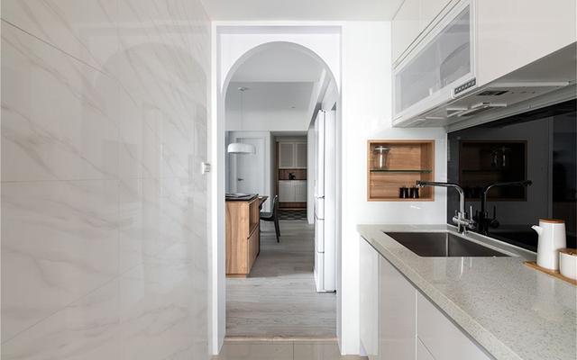 厨房的空间比较小,但完全能够满足日常烹饪需要,利用吊柜和地柜的空间进行收纳,整个厨房清新了许多。台面采用的是石英石材质,打理起来特别轻松,不会有油腻感觉。厨房的墙壁巧妙设计了壁龛,能够存放日常所用的调料,看起来美观大方。