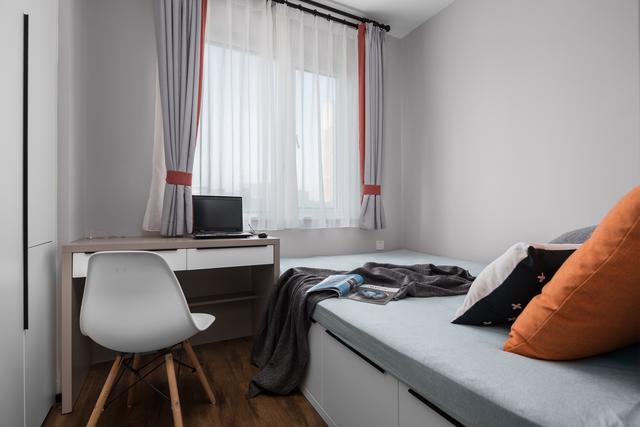 次卧的装修一看就是一间儿童房,由于空间比较小,所以打造的是一个榻榻米的床铺,一体式设计了可以实现收纳的学习桌。床铺带有抽屉式收纳,可以解决房间内的收纳难题,而且虽然房间不大,但是靠墙也设计了衣柜,可以满足孩子日常生活所需。