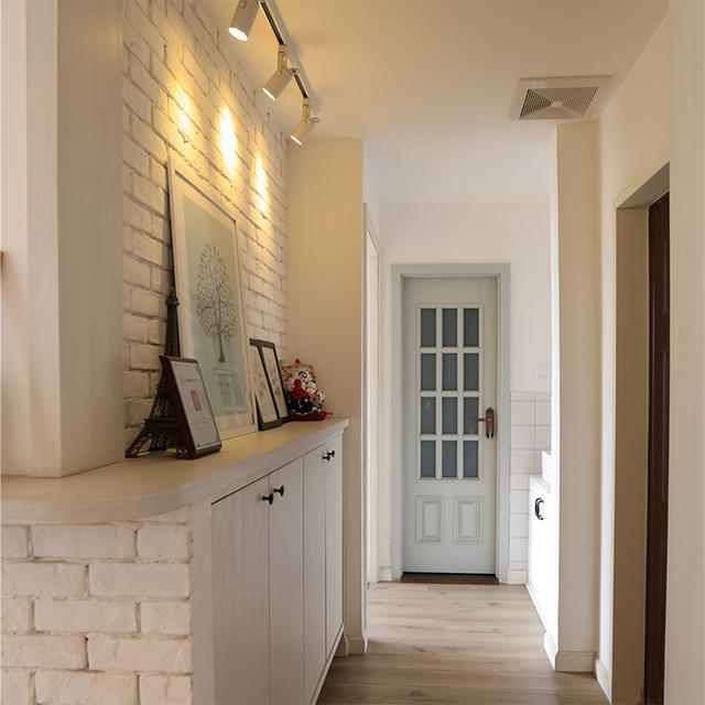 玄关的走廊空间,靠墙的地方打造的是一排的鞋柜,白色的鞋柜刚好属于一种打洞式的设计,这样更加的节省空间。鞋柜上面带有一个台面,刚好上面可以摆放一些相框摆件,能够起到很好的美化装饰的作用,刚好鞋柜的地方,顶部挂放一排射灯,起到了很好的照明和装饰的作用。