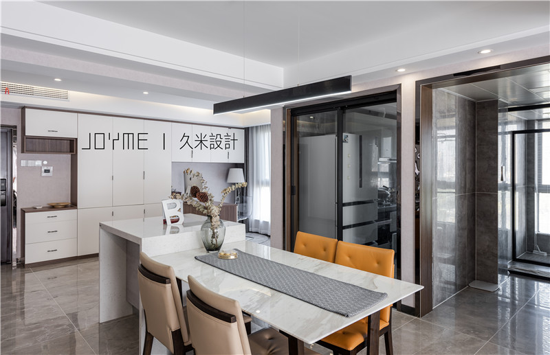 在色彩方面是黑与橙的大胆碰撞,加一些相衬映的淡色,让整体空间是在暗色系的情况下依旧能保持亮度明亮,一些通透的家居品的精致感,还有石材上一些颜色的选择,都让整个空间更明亮了许多。