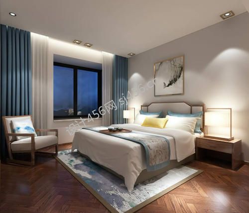 123平米新中式三居室卧室背景墙装修效果图
